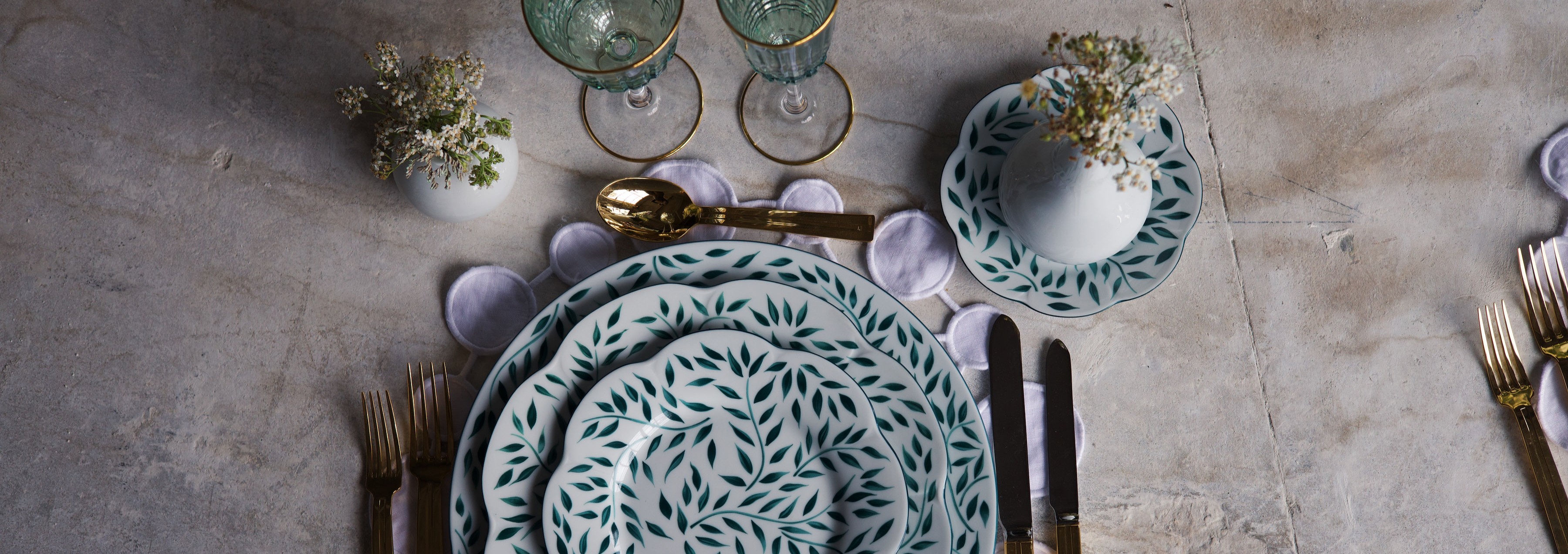 Éclatante de fraîcheur, la collection Olivier Vert Filet Vert célèbre le renouveau de la nature à travers un décor poétique de feuilles et de branches d’olivier.